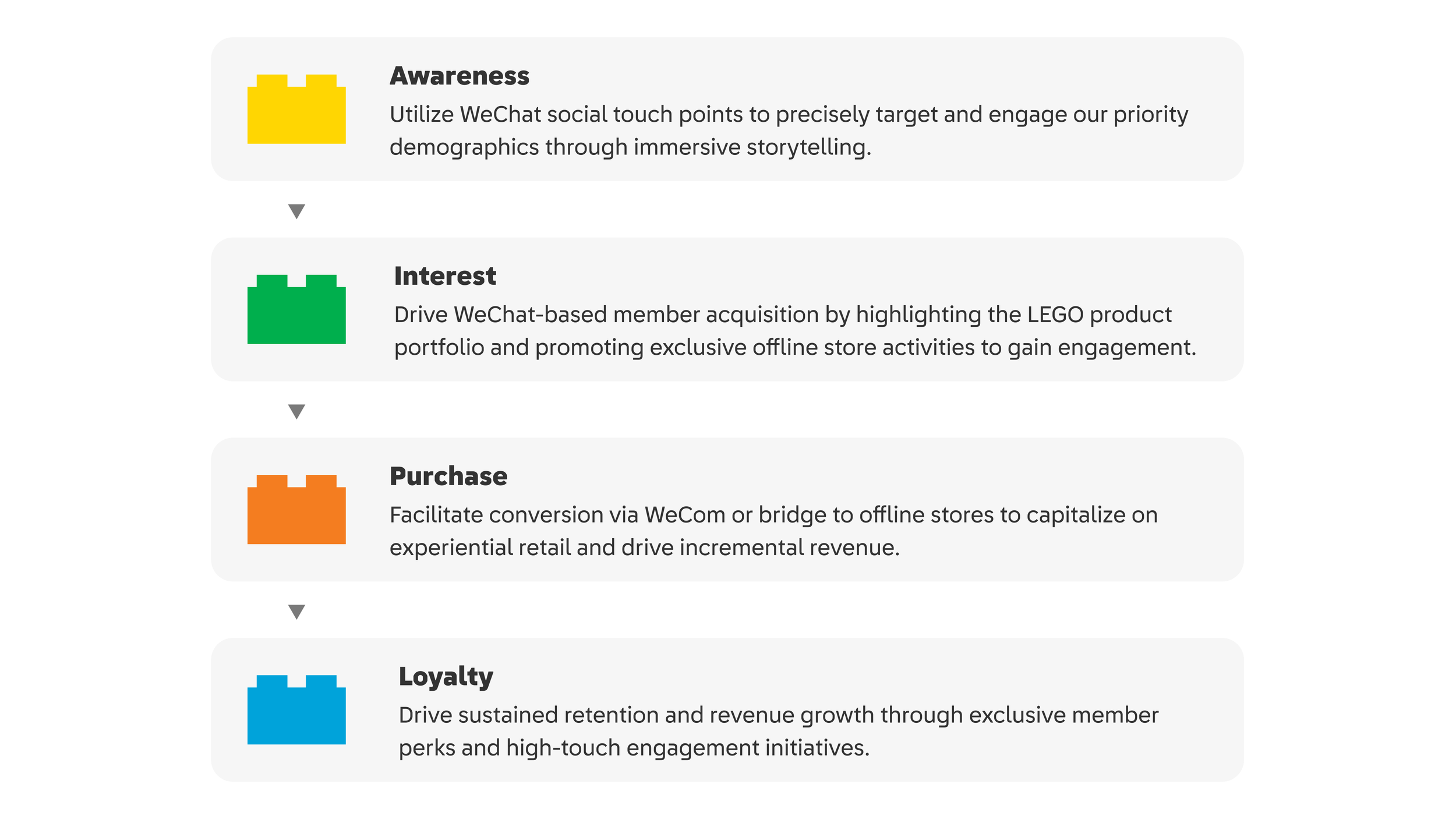 In China’s WeChat-dominant ecosystem, LEGO prioritizes a Mini-program-first strategy to capture and engage consumers. By leveraging WeCom and social touch points for targeted outreach, we create a seamless O2O journey—driving digital members to immersive offline store experiences. This integrated approach, underpinned by high-value retention rewards, maximizes Member Lifetime Value (LTV) and fuels sustained revenue growth.